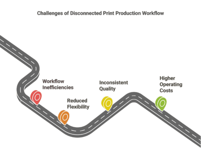 In a print production process with various disjointed components, disruptions in your workflow might seem inevitable. If your print production consists of a patchwork of different software and disparate print and finishing systems that require manual intervention between production stages, how can you simplify this process and streamline the entire workflow?