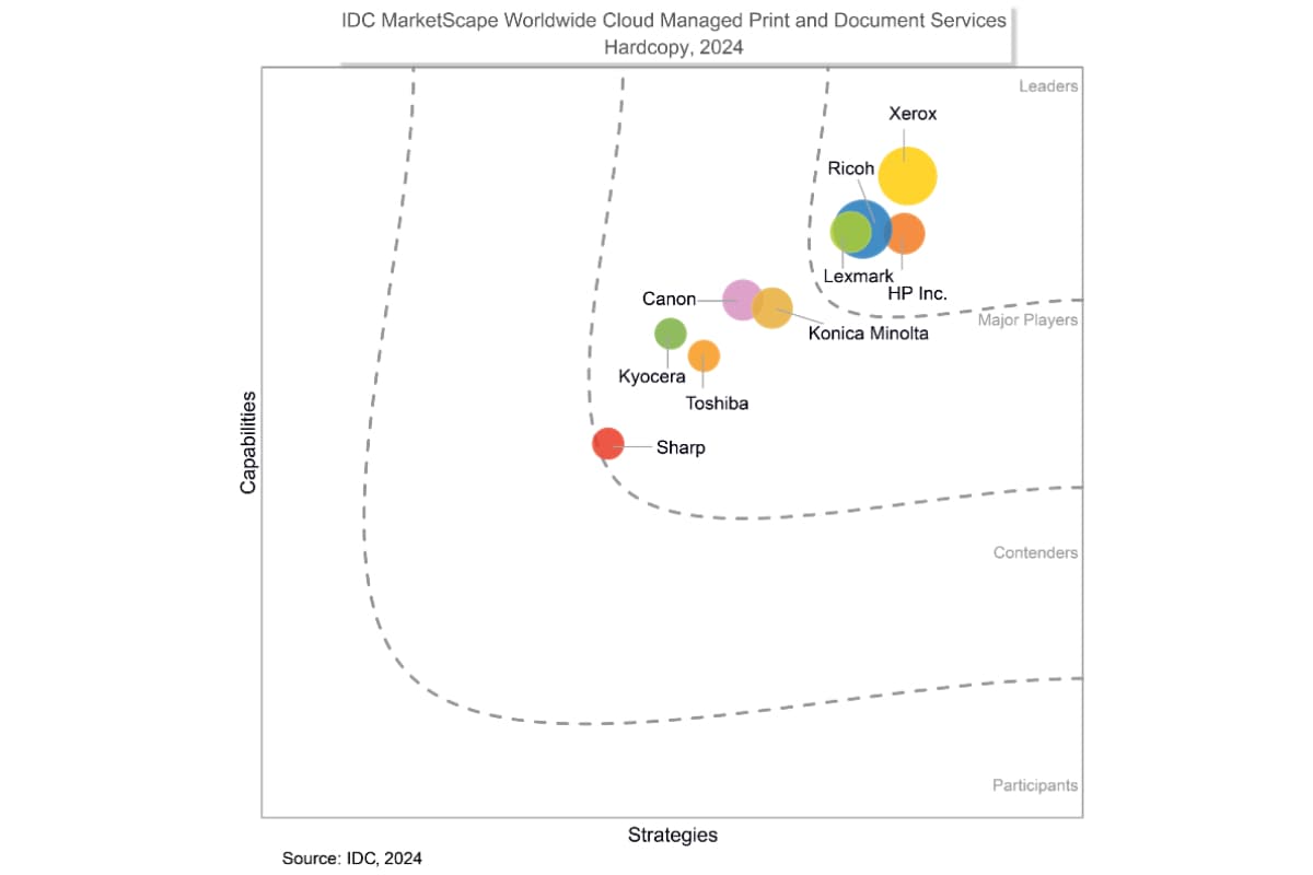 A premier global marketing intelligence firm, IDC evaluated vendors who had services and solutions including cloud-based managed print and document services, contractual print service models that target both enterprise and SMB, and delivery models including capabilities and strategies deployed by hardcopy vendors in support of direct engagements and channel-delivered print services programs.
